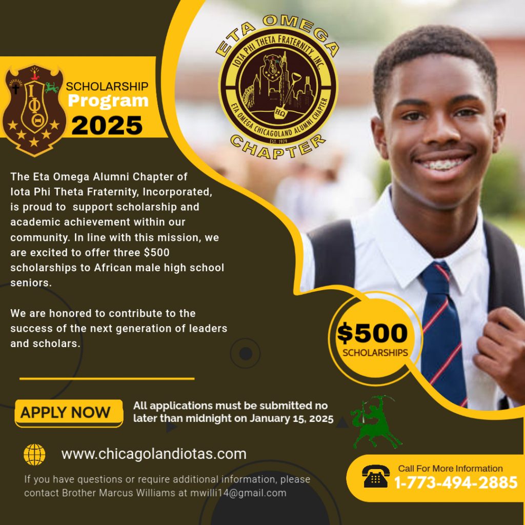 The Eta Omega Alumni Chapter of Iota Phi Theta Fraternity, Incorporated, is proud to support scholarship and academic achievement within our community. In line with this mission, we are excited to offer three $500 scholarships to African American male high school seniors. This opportunity is designed for students who demonstrate a strong passion for learning, active community involvement, and a need for financial support. We are honored to contribute to the success of the next generation of leaders and scholars.